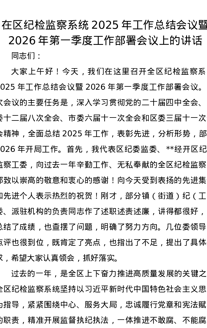 在区纪检监察系统2025年工作总结会议暨2026年第一季度工作部署会议上的讲话