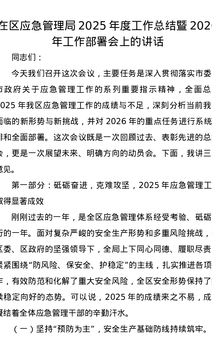 在区应急管理局2025年度工作总结暨2026年工作部署会上的讲话