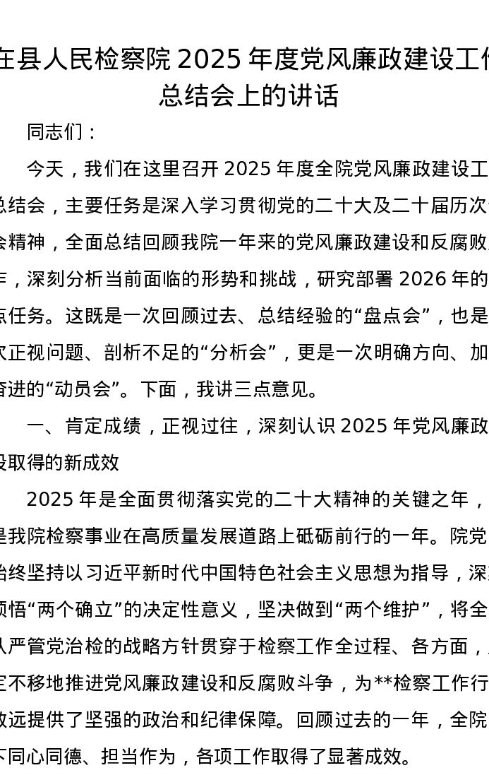 在县人民检察院2025年度党风廉政建设工作总结会上的讲话