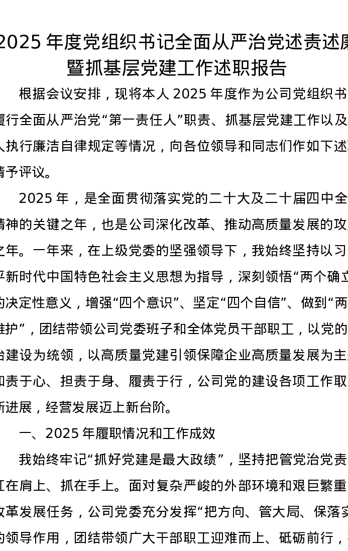 2025年度党组织书记全面从严治党述责述廉暨抓基层党建工作述职报告