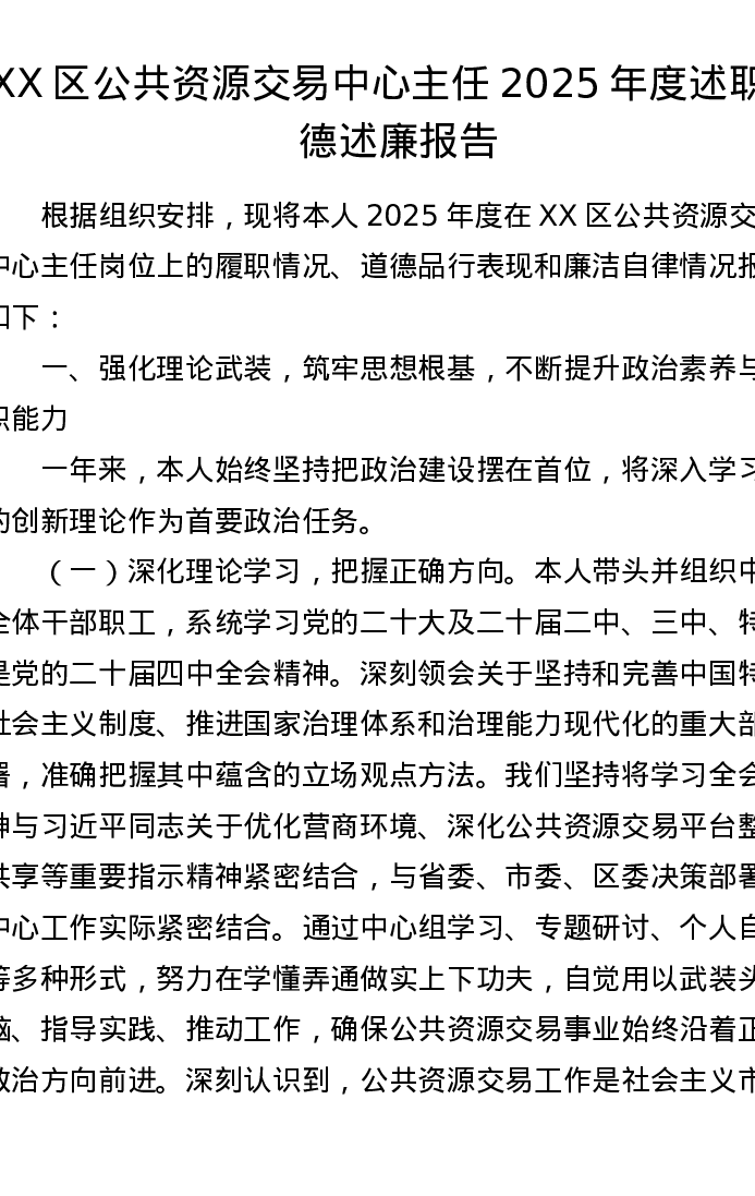 XX区公共资源交易中心主任2025年度述职述德述廉报告