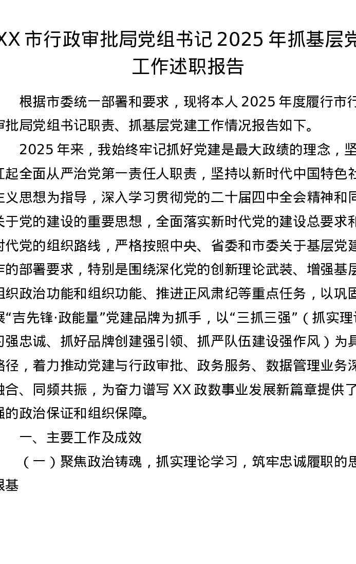 XX市行政审批局党组书记2025年抓基层党建工作述职报告