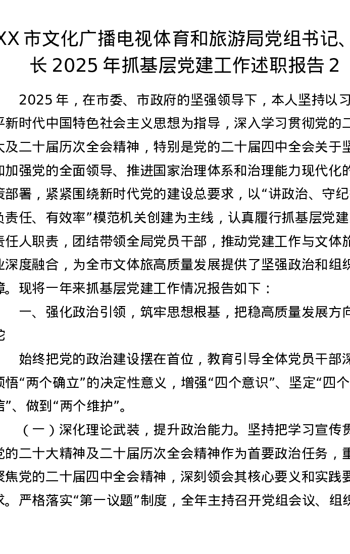 XX市文化广播电视体育和旅游局党组书记、局长2025年抓基层党建工作述职报告2