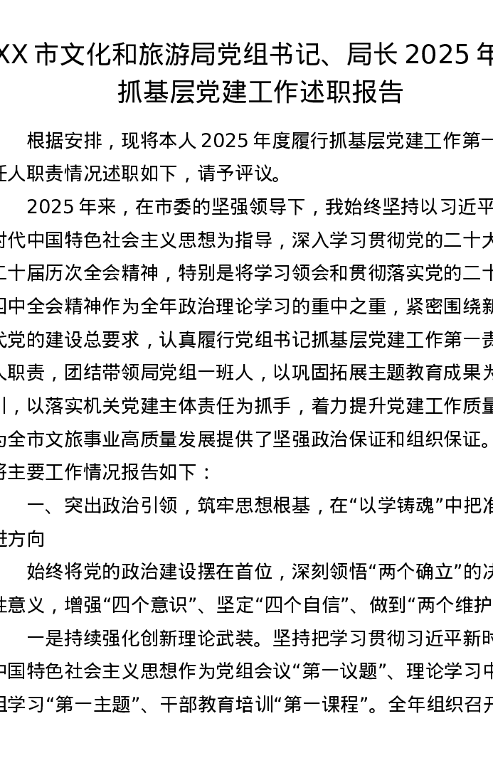 XX市文化和旅游局党组书记、局长2025年度抓基层党建工作述职报告