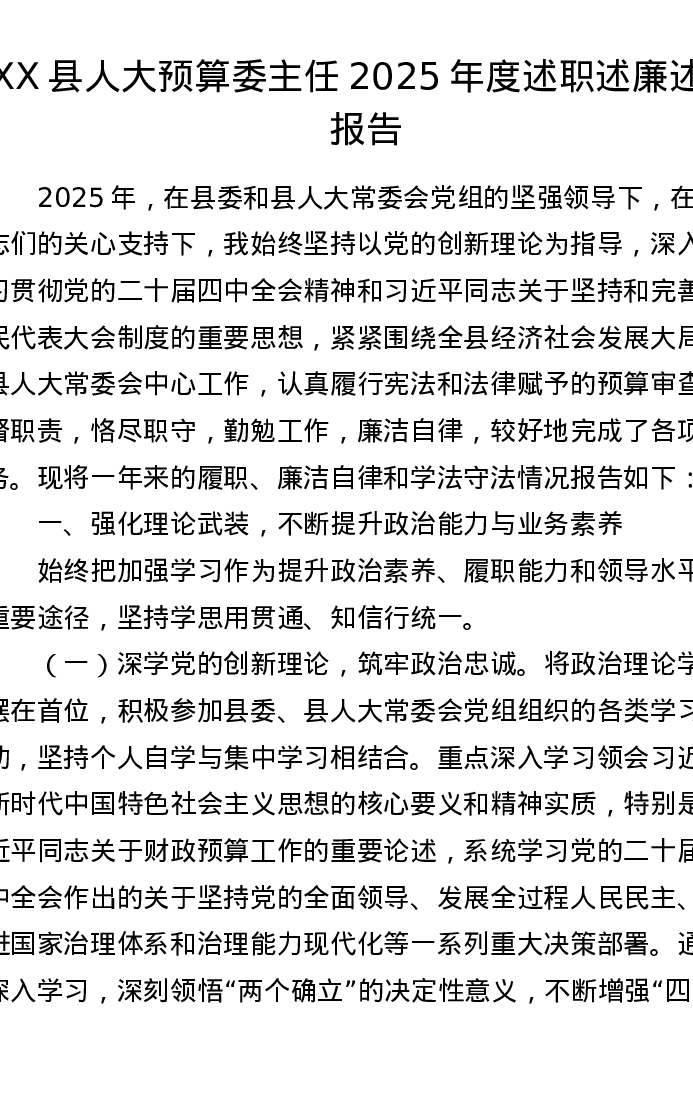 XX县人大预算委主任2025年度述职述廉述法报告