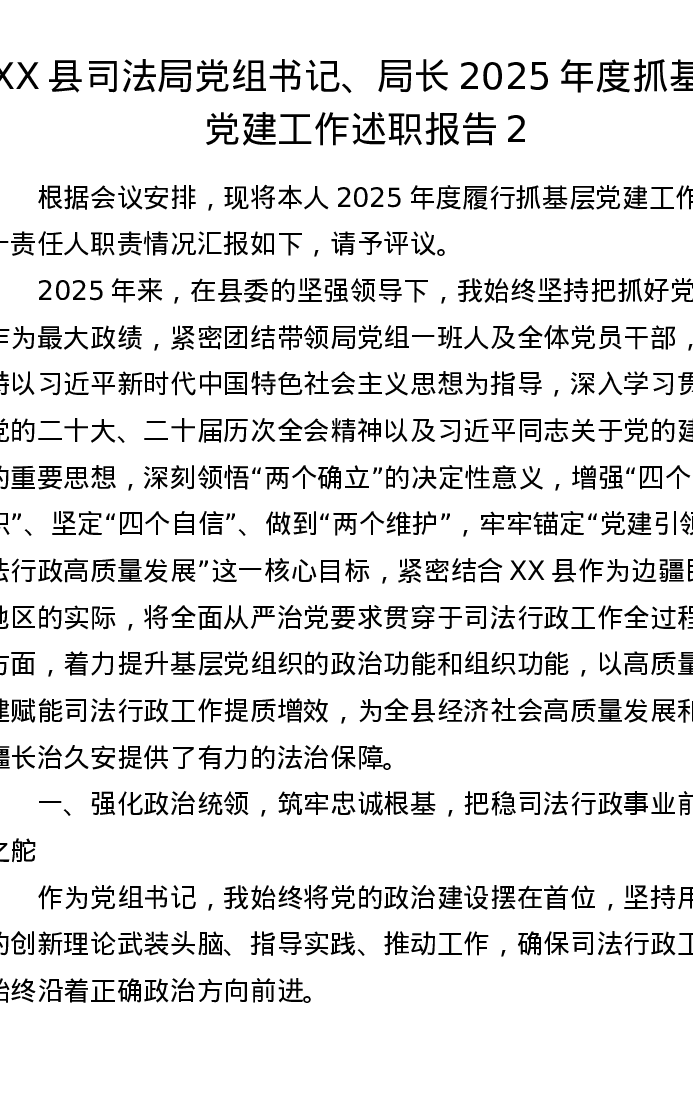 XX县司法局党组书记、局长2025年度抓基层党建工作述职报告2