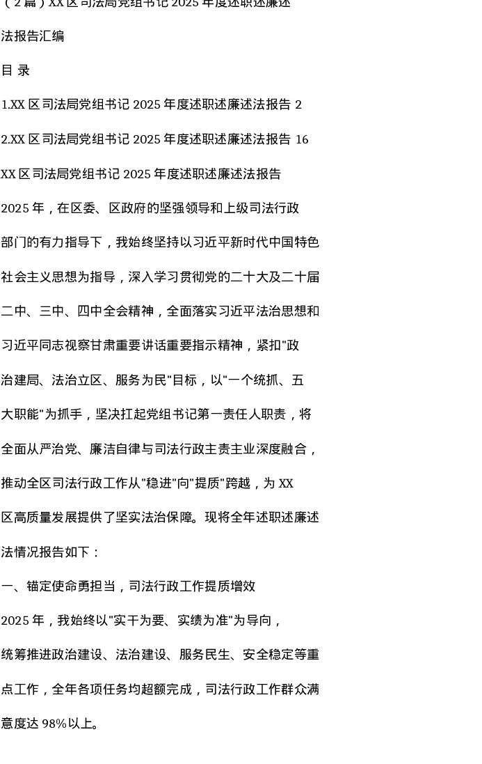 汇编:XX区司法局党组书记2025年度述职述廉述法报告2篇