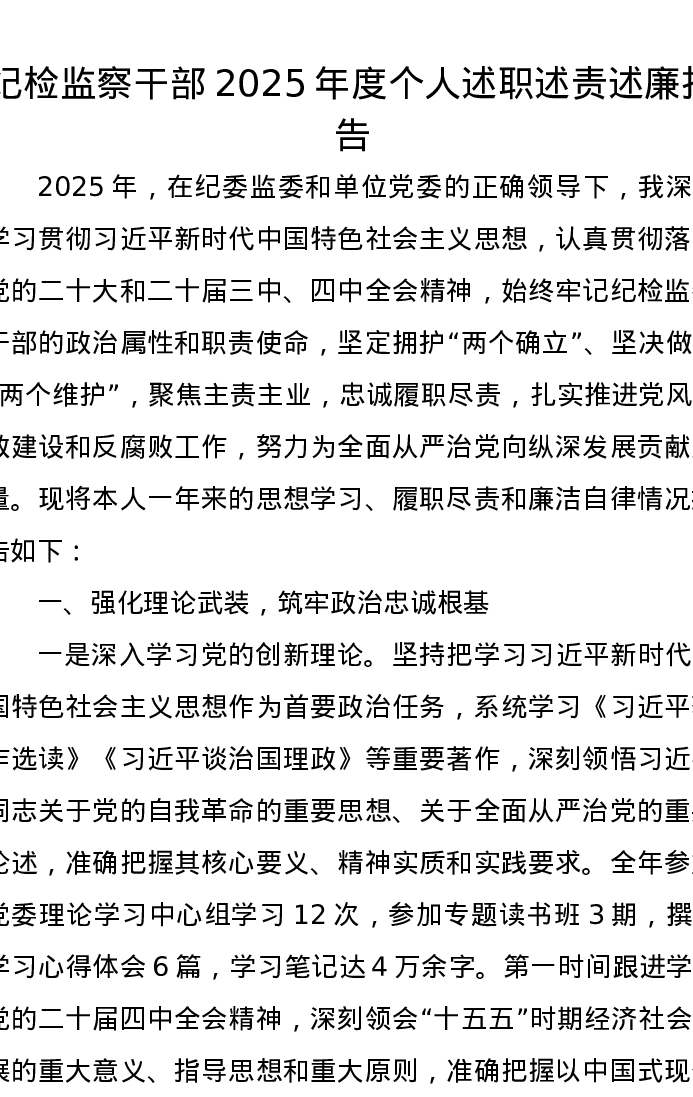 纪检监察干部2025年度个人述职述责述廉报告