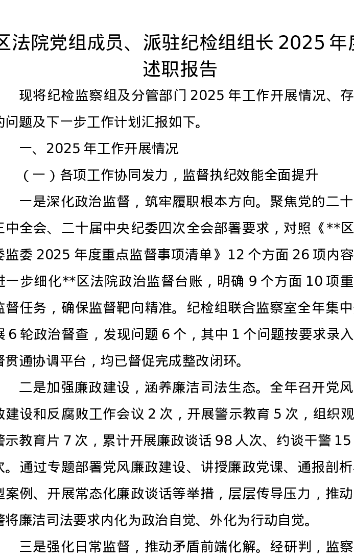 区法院党组成员、派驻纪检组组长2025年度述职报告