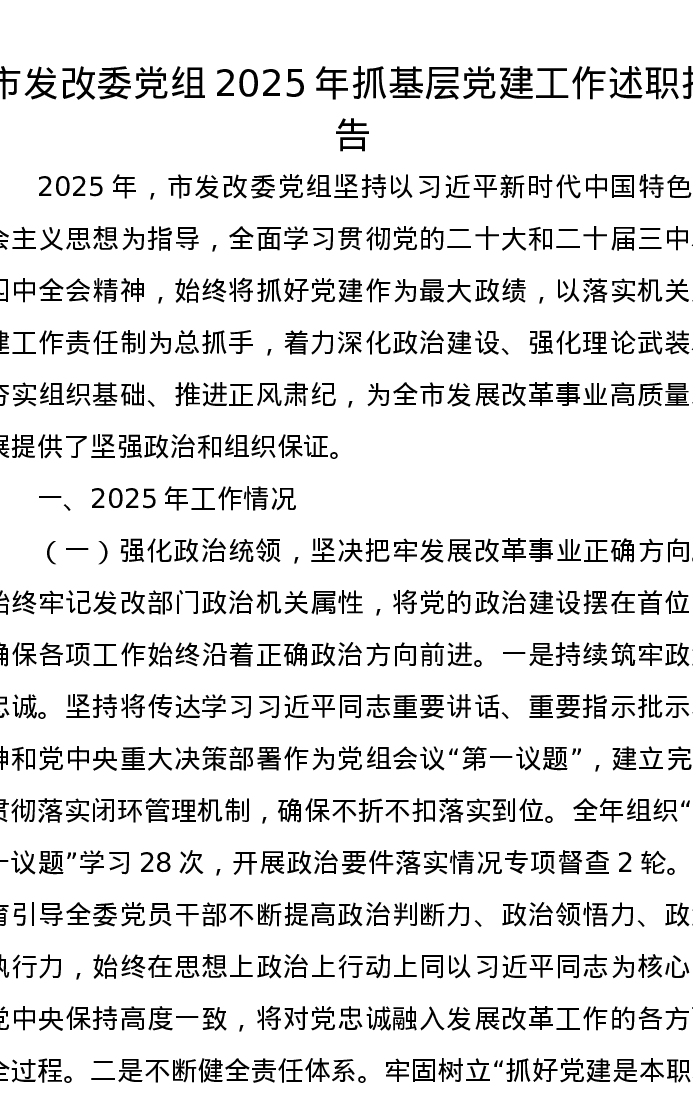 市发改委党组2025年抓基层党建工作述职报告