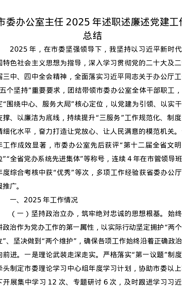 市委办公室主任2025年述职述廉述党建工作总结