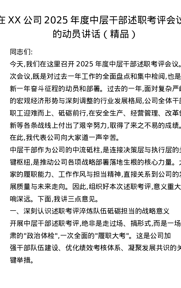 在XX公司2025年度中层干部述职考评会议上的动员讲话