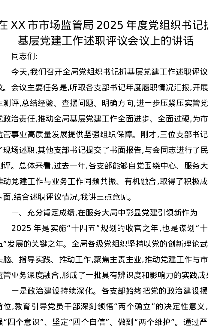 在XX市市场监管局2025年度党组织书记抓基层党建工作述职评议会议上的讲话