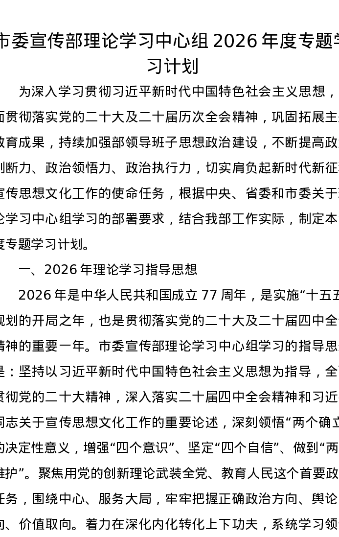 市委宣传部理论学习中心组2026年度专题学习计划