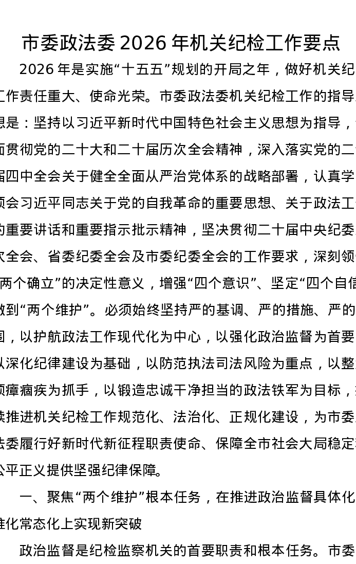 市委政法委2026年机关纪检工作要点