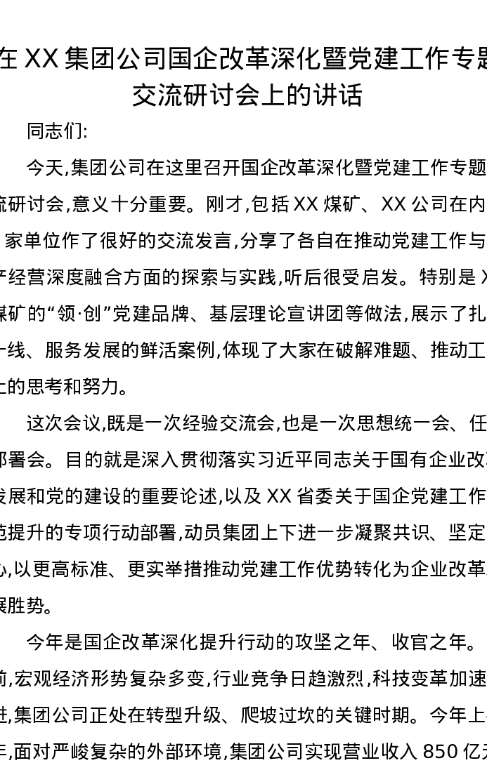 在XX集团公司国企改革深化暨党建工作专题交流研讨会上的讲话