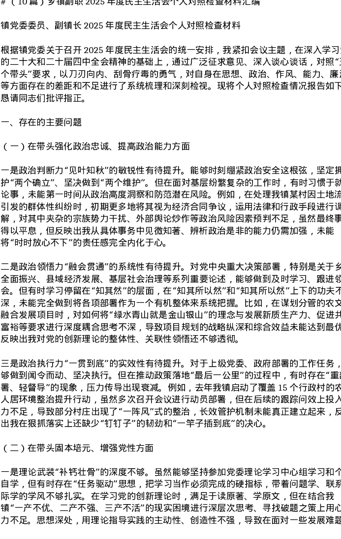 汇编:乡镇副职2025年度xxxxx个人对照检查材料汇编
