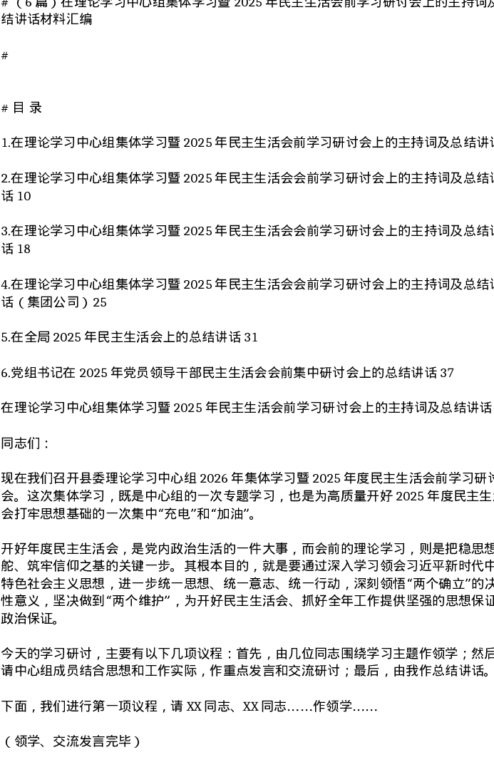 汇编:在理论学习中心组集体学习暨2025年xxxxx前学习研讨会上的主持词及总结讲话材料6篇