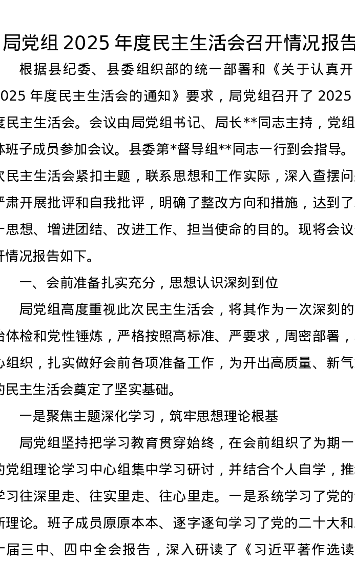 局党组2025年度xxxxx召开情况报告