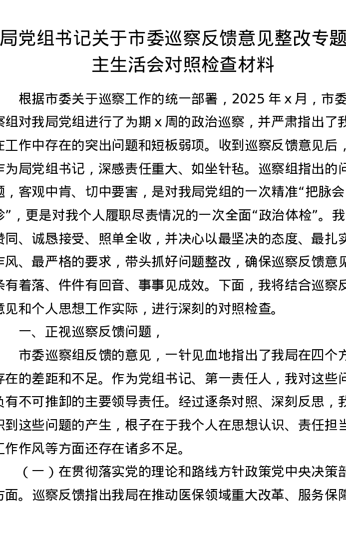 局党组书记关于市委巡察反馈意见整改专题xxxxx对照检查材料