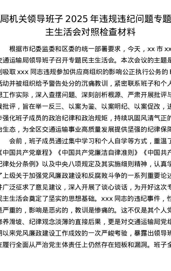 局机关领导班子2025年违规违纪问题专题xxxxx对照检查材料