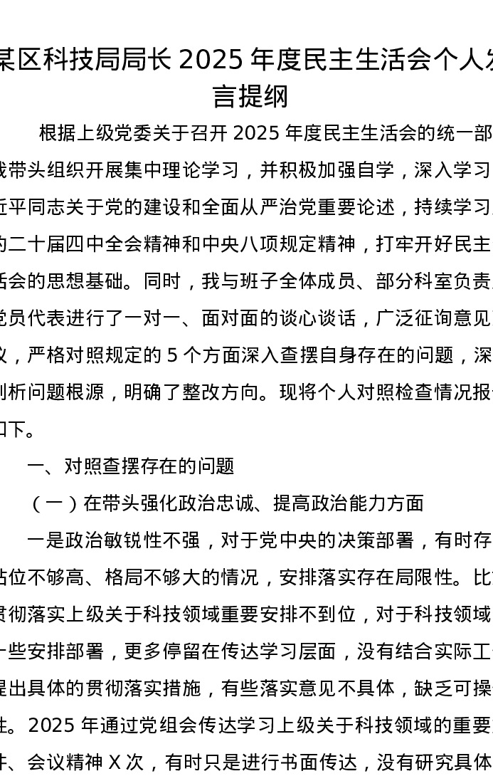某区科技局局长2025年度xxxxx个人发言提纲