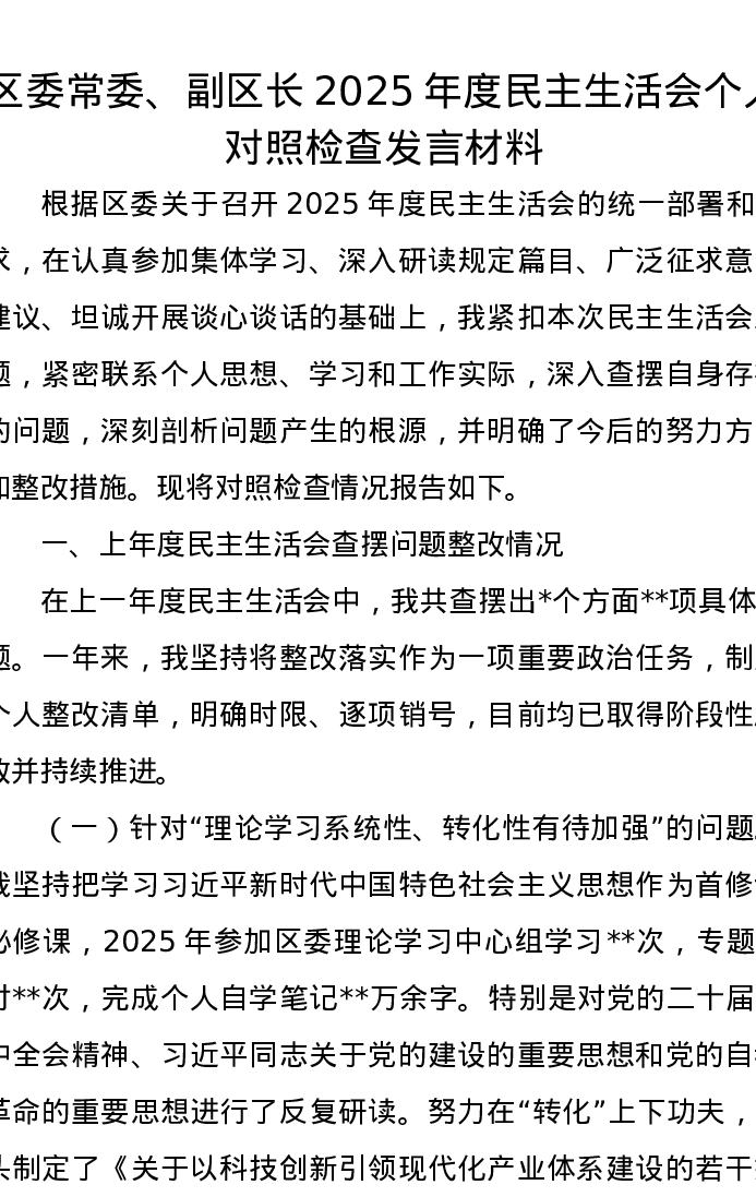 区委常委、副区长2025年度xxxxx个人对照检查发言材料
