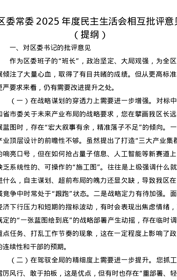 区委常委2025年度xxxxx相互批评意见(提纲)