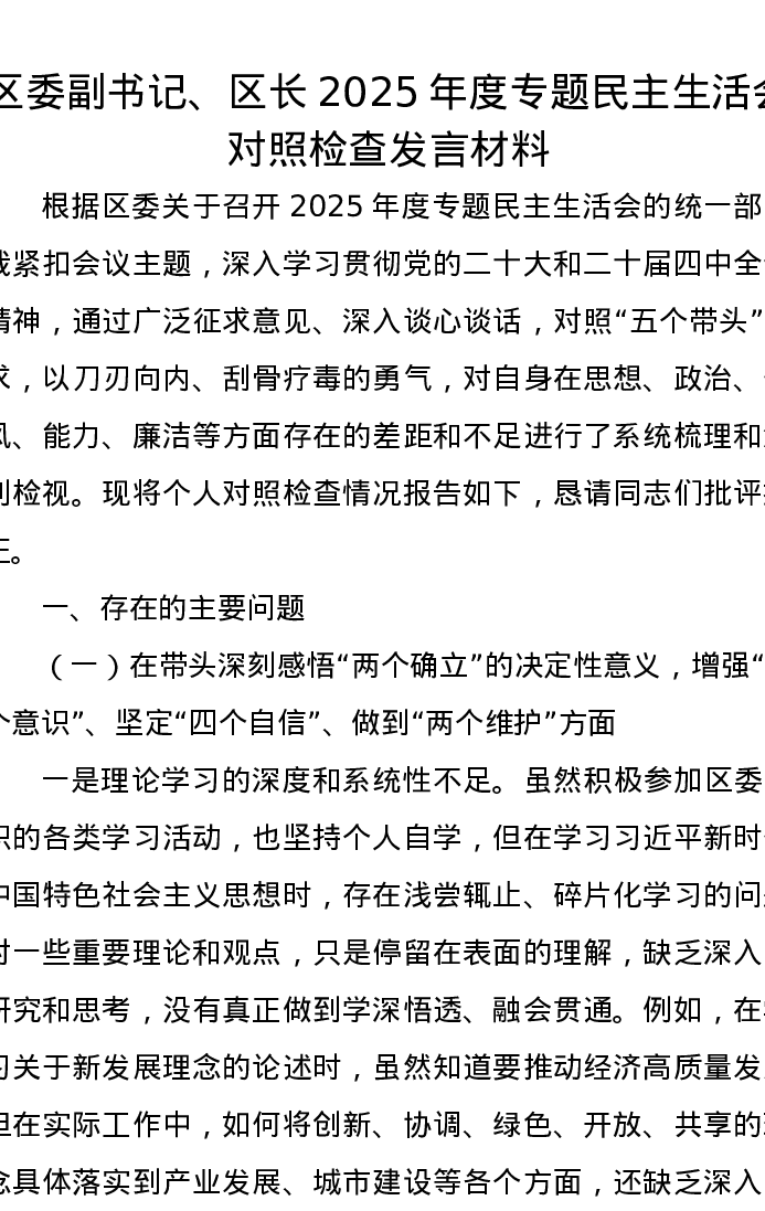 区委副书记、区长 2025 年度专题xxxxx对照检查发言材料