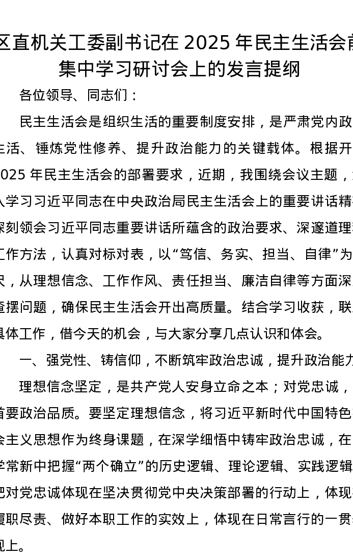 区直机关工委副书记在2025年xxxxx前集中学习研讨会上的发言提纲