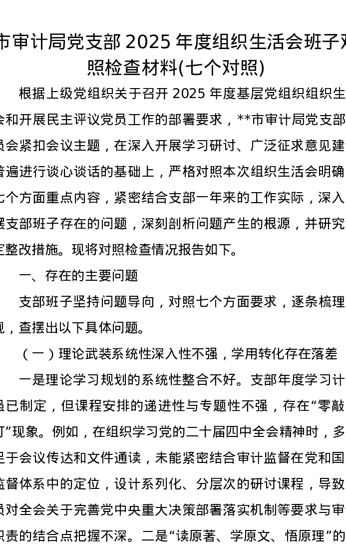 市审计局党支部2025年度组织xxx班子对照检查材料(七个对照)