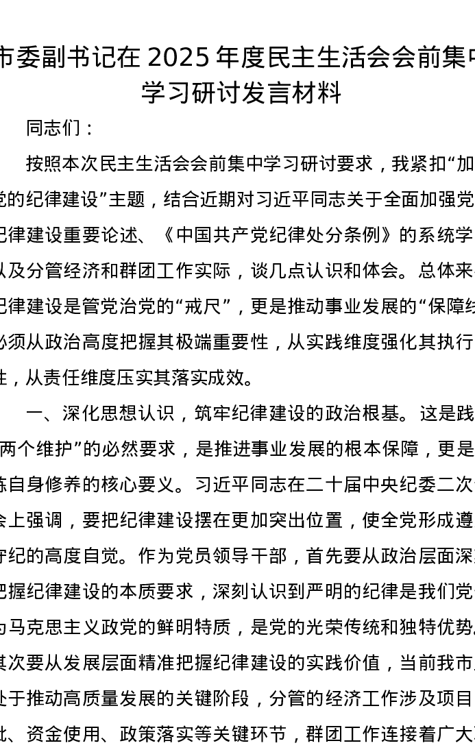 市委副书记在2025年度xxxxx会前集中学习研讨发言材料