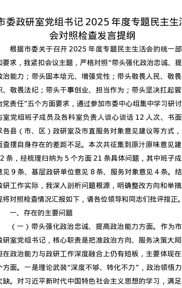 市委政研室党组书记2025年度专题xxxxx对照检查发言提纲
