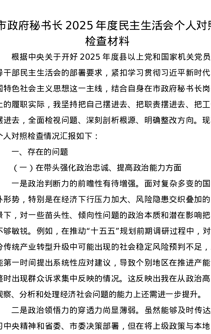 市政府秘书长2025年度xxxxx个人对照检查材料