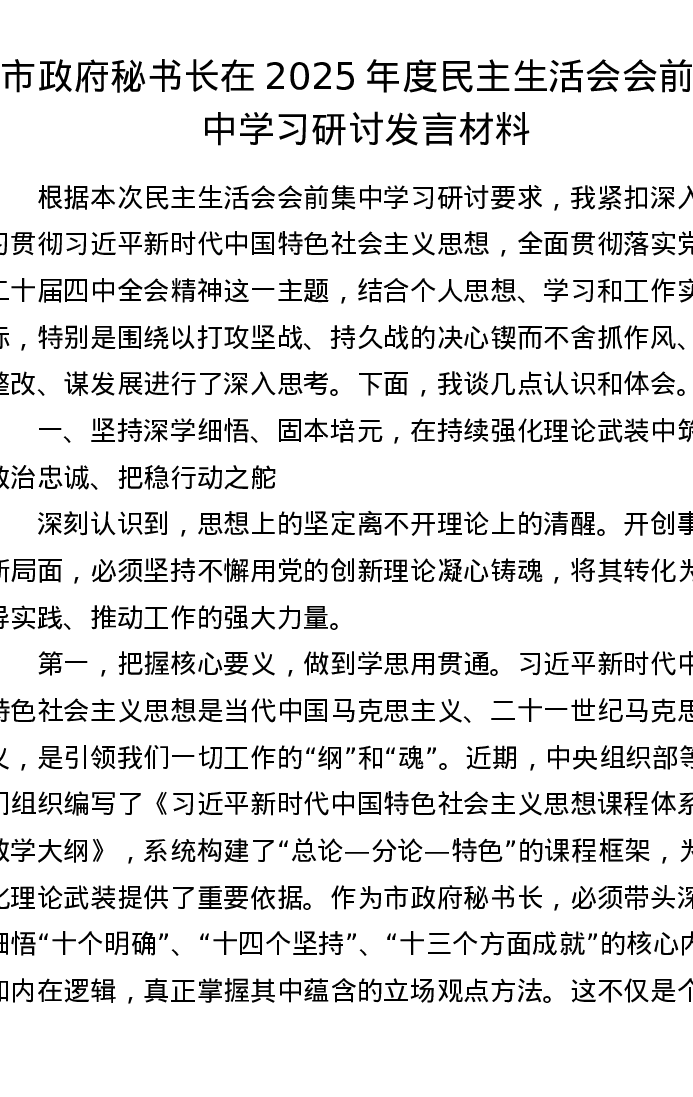 市政府秘书长在2025年度xxxxx会前集中学习研讨发言材料