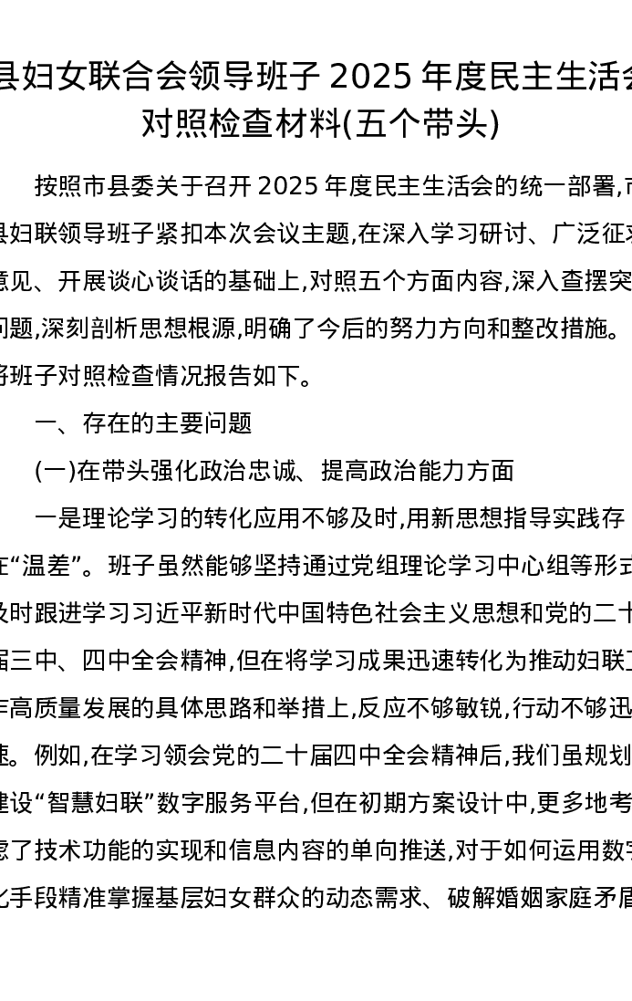 县妇女联合会领导班子2025年度xxxxx对照检查材料(五个带头)