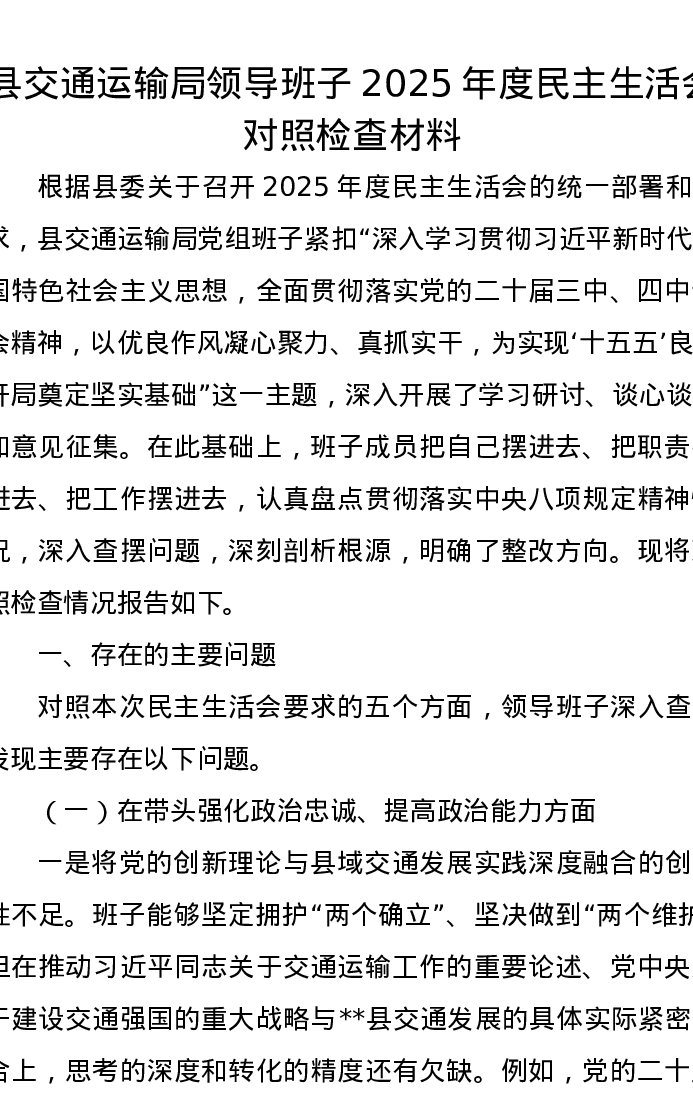 县交通运输局领导班子2025年度xxxxx对照检查材料