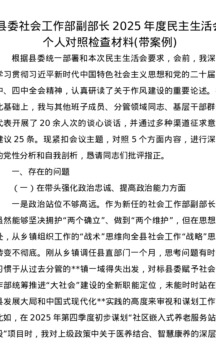 县委社会工作部副部长2025年度xxxxx个人对照检查材料(带案例)