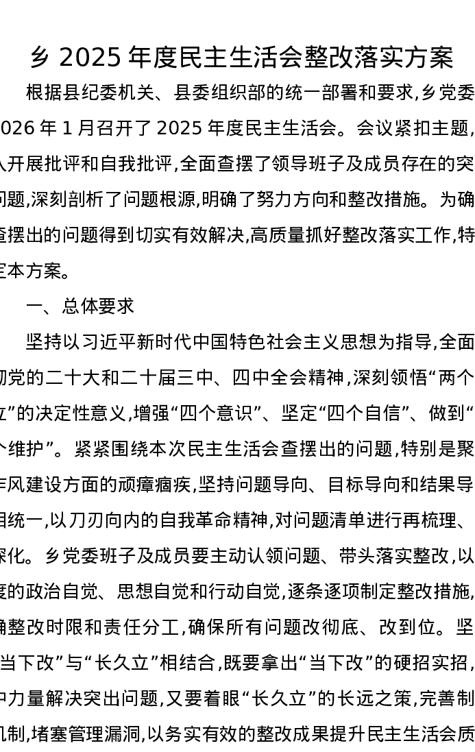 乡2025年度xxxxx整改落实方案