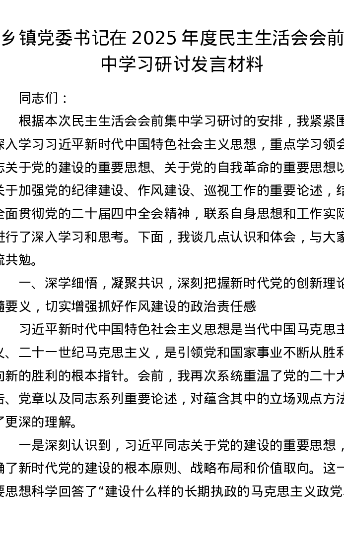 乡镇党委书记在2025年度xxxxx会前集中学习研讨发言材料