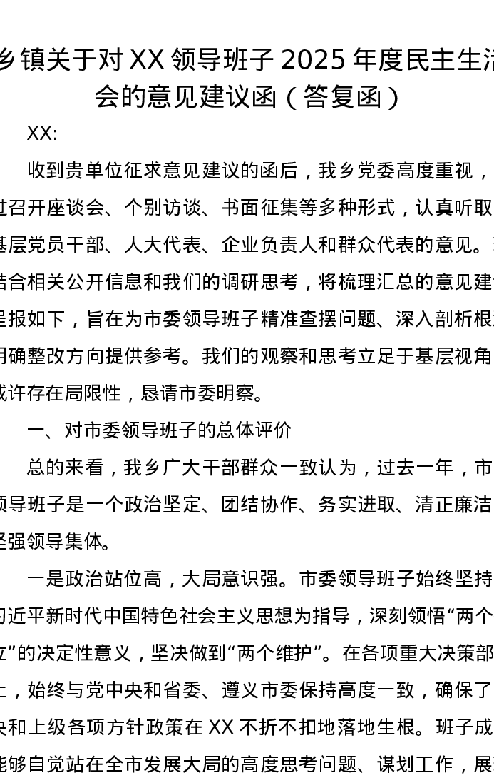 乡镇关于对XX领导班子2025年度xxxxx的意见建议函(答复函)