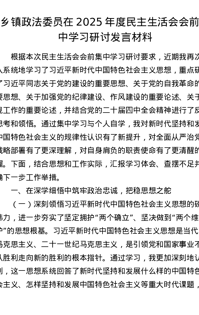 乡镇政法委员在2025年度xxxxx会前集中学习研讨发言材料