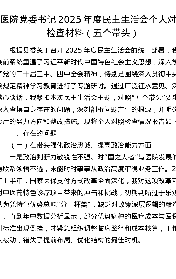医院党委书记2025年度xxxxx个人对照检查材料(五个带头)