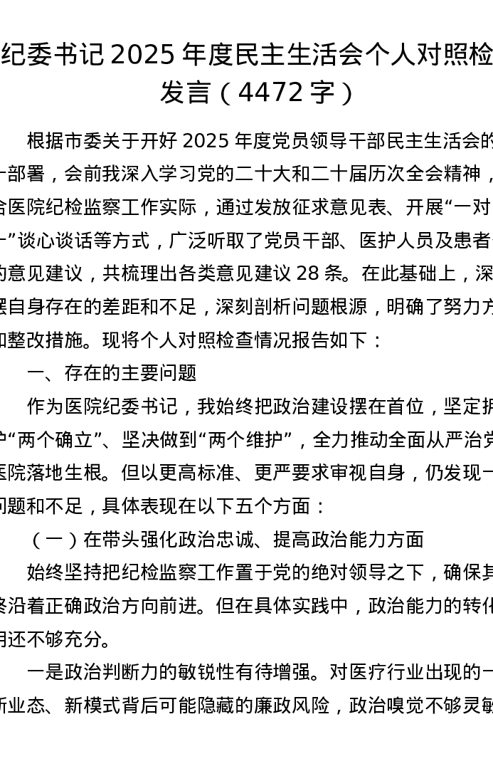 医院纪委书记2025年度xxxxx个人对照检视发言(4474字)