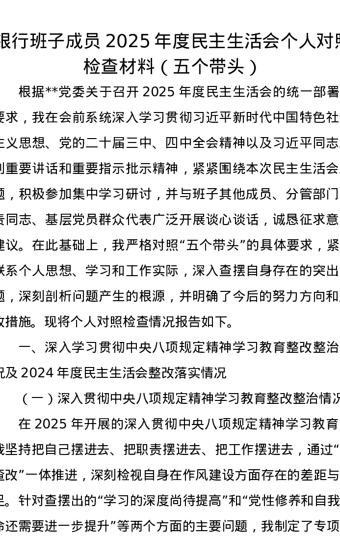 银行班子成员2025年度xxxxx个人对照检查材料(五个带头)