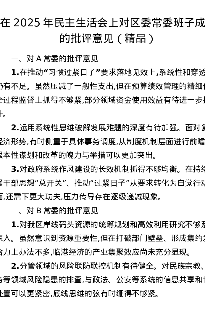 在2025年xxxxx上对区委常委班子成员的批评意见