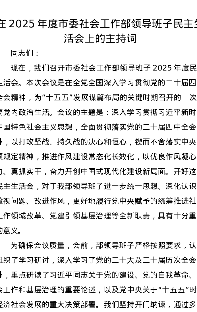 在2025年度市委社会工作部领导班子xxxxx上的主持词