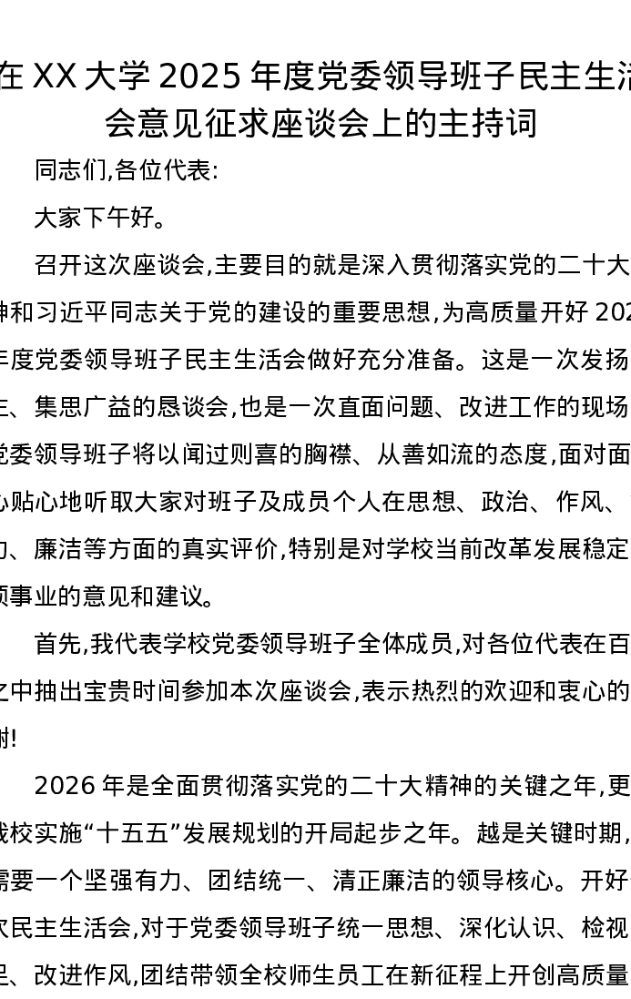 在XX大学2025年度党委领导班子xxxxx意见征求座谈会上的主持词