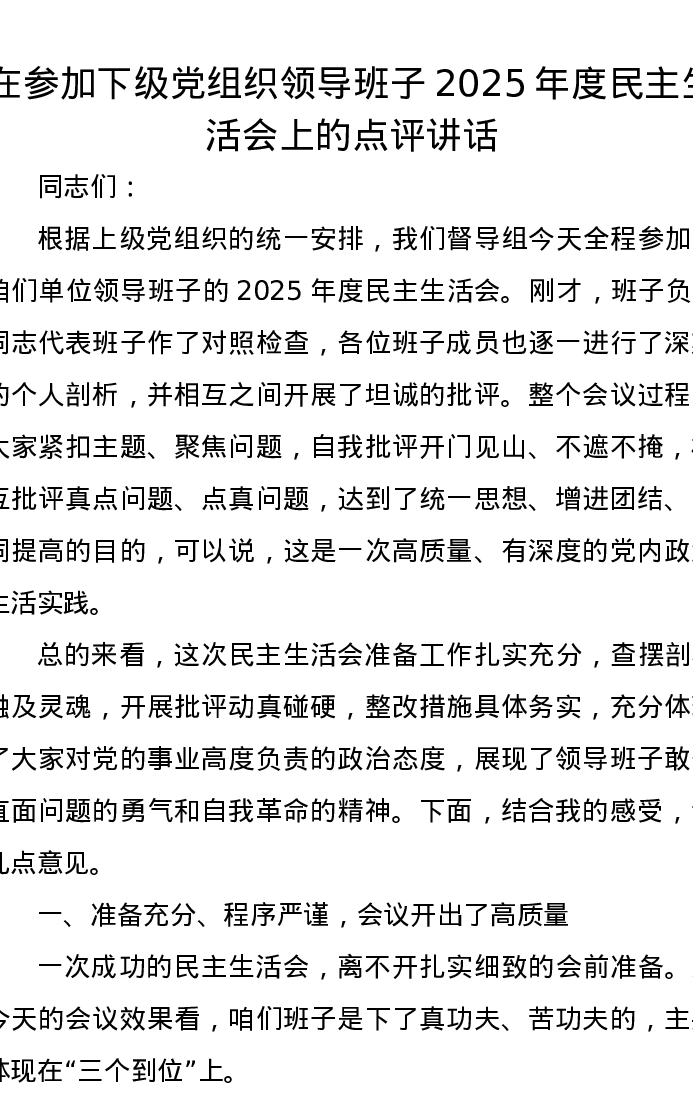 在参加下级党组织领导班子2025年度xxxxx上的点评讲话