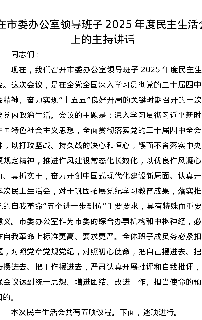 在市委办公室领导班子2025年度xxxxx上的主持讲话